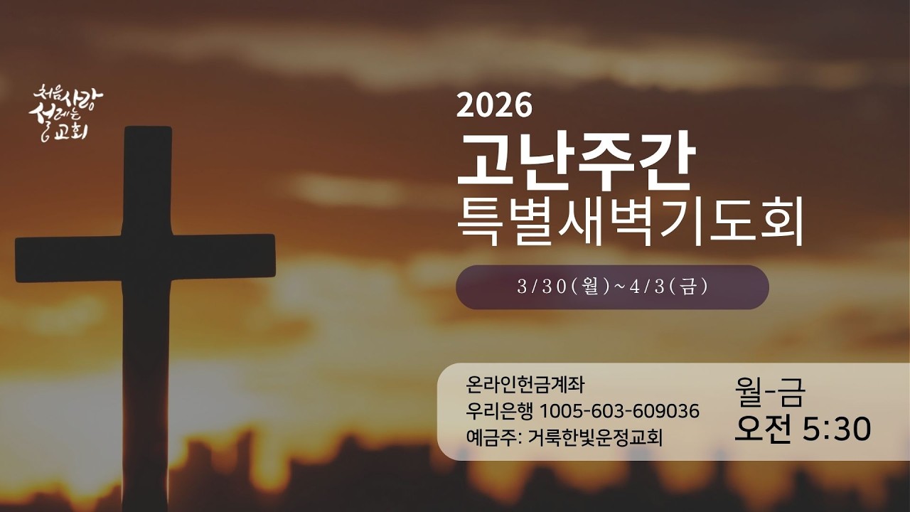 [260403 고난주간 특별새벽기도회]     1. 예배합니다   [1] 완전하신 나의 주 의의 길로 날 인도하소서   행하신 모든 일 주님의 영광 다 경배합니다   완전하신 나의 주 의의 길로 날 인도하소서   행하신 모든 일 주님의 영광 다 경배합니다   예배합니다 찬양합니다 주님만 날 다스리소서   예배합니다 찬양합니다 주님 홀로 높임 받으소서   [2] 완전하신 나의 주 의의 길로 날 인도하소서   행하신 모든 일 주님의 영광 다 경배합니다   완전하신 나의 주 의의 길로 날 인도하소서   행하신 모든 일 주님의 영광 다 경배합니다   예배합니다 찬양합니다 주님만 날 다스리소서   예배합니다 찬양합니다 주님 홀로 높임 받으소서   예배합니다 찬양합니다 주님만 날 다스리소서   예배합니다 찬양합니다 주님 홀로 높임 받으소서   예배합니다 찬양합니다 주님만 날 다스리소서   예배합니다 찬양합니다 주님 홀로 높임 받으소서     2. 그 사랑   [1] 아버지 사랑 내가 노래해 아버지 은혜 내가 노래해   그 사랑 변함 없으신 거짓 없으신 성실하신 그 사랑   상한 갈대 꺾지 않으시는 꺼져가는 등불 끄지 않는   그 사랑 변함 없으신 거짓 없으신 진실하신 그 사랑 사랑   그 사랑 날 위해 죽으신 날 위해 다시 사신 예수 그리스도 다시 오실 그 사랑   죽음도 생명 천사도 하늘의 어떤 권세도 끊을 수 없는 영원한 그 사랑 예수   [2] 아버지 사랑 내가 노래해 아버지 은혜 내가 노래해   그 사랑 변함 없으신 거짓 없으신 성실하신 그 사랑   상한 갈대 꺾지 않으시는 꺼져가는 등불 끄지 않는   그 사랑 변함 없으신 거짓 없으신 진실하신 그 사랑 사랑   그 사랑 날 위해 죽으신 날 위해 다시 사신 예수 그리스도 다시 오실 그 사랑   죽음도 생명 천사도 하늘의 어떤 권세도 끊을 수 없는 영원한 그 사랑 예수   그 사랑 날 위해 죽으신 날 위해 다시 사신 예수 그리스도 다시 오실 그 사랑   죽음도 생명 천사도 하늘의 어떤 권세도 끊을 수 없는 영원한 그 사랑 예수   그 사랑 날 위해 죽으신 날 위해 다시 사신 예수 그리스도 다시 오실 그 사랑   죽음도 생명 천사도 하늘의 어떤 권세도 끊을 수 없는 영원한 그 사랑 예수